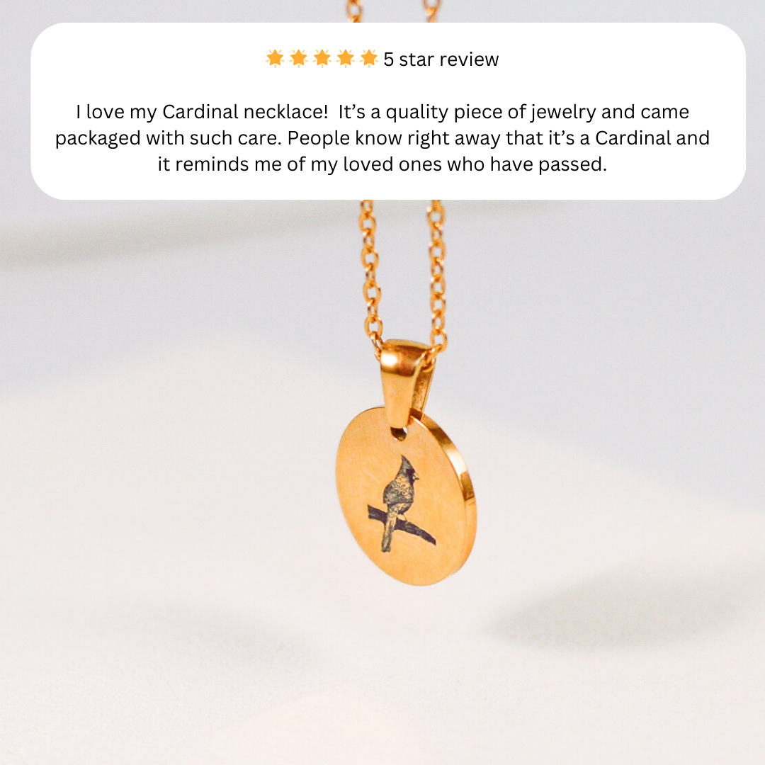 I love my Cardinal necklace! It’s a quality piece of jewelry and came packaged with such care. People know right away that it’s a Cardinal and it reminds me of my loved ones who have passed.