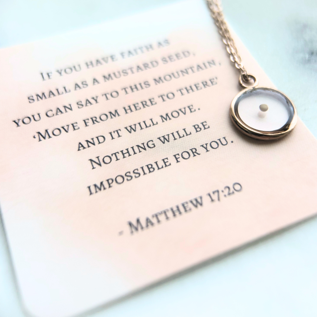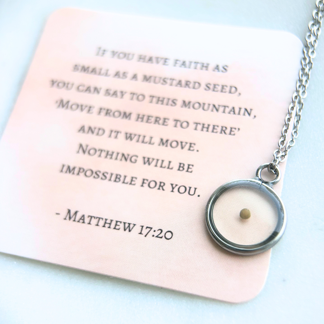 Absolutely beautiful reminder to carry with me every day. The resin is smooth and clear with the mustard seed placed perfectly. Everything was packed with obvious love and care when I received it. This necklace is easily my favorite one I own now.