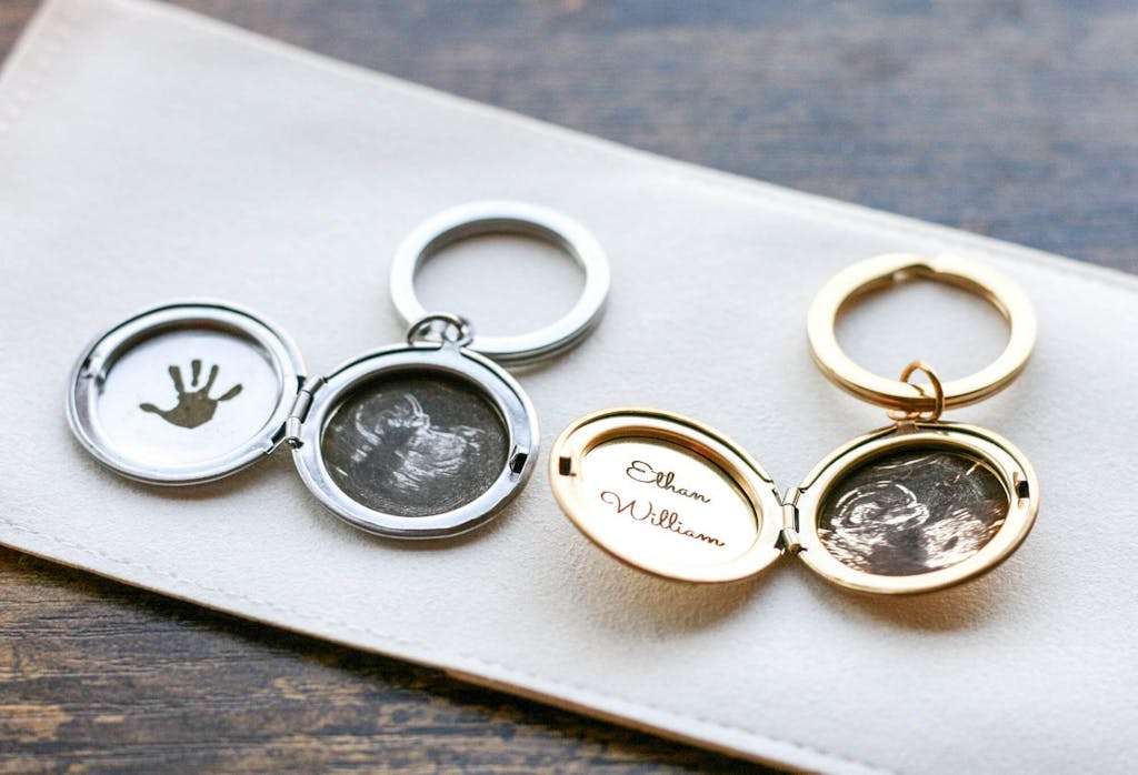 This engraved sonogram locket keychain contains your own engraved sonogram, preserving it forever. By engraving it into a locket, the ultrasound photo can be kept close and preserved forever.